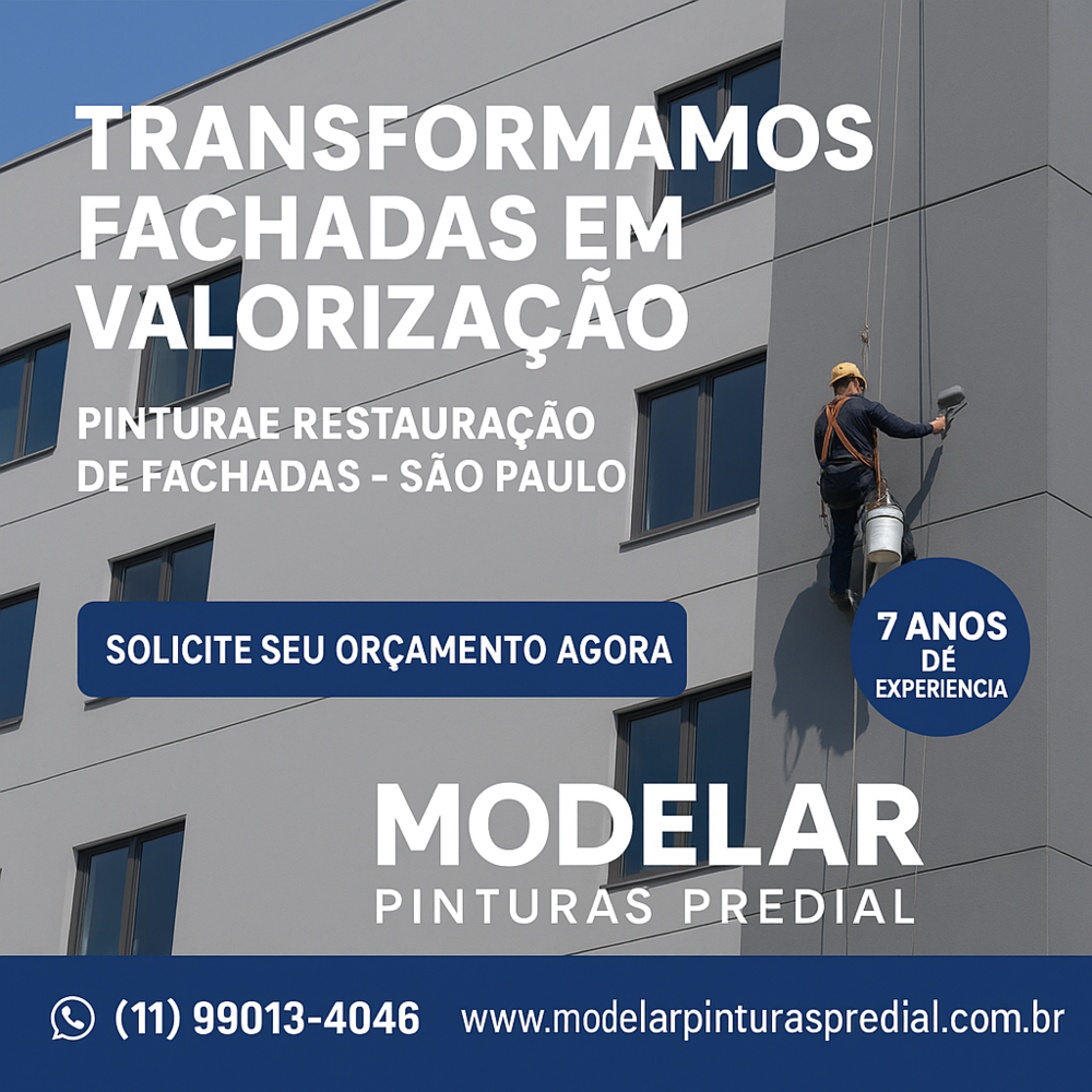 A Modelar Pintura Predial é especializada em serviços de pintura predial, manutenção de fachadas e revitalização de imóveis em São Paulo e região. Com equipe treinada, técnicas modernas e materiais de alta qualidade, oferecemos resultados duráveis, seguros e com acabamento impecável.